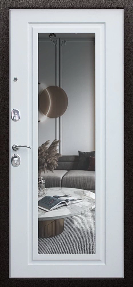 Надежная входная Дверь Комфорт с зеркалом премиум класса по цене 30 910 руб. Большая толщина стали защитит от проникновения в ваш дом, квартиру или коттедж. Используется очень качественная фурнитура: замки, цилиндры, ручки, защелки. Покрытие и отделка двери изготовлено под внимательным контролем производителя. Дверь имеет долгий срок службы и гарантию.